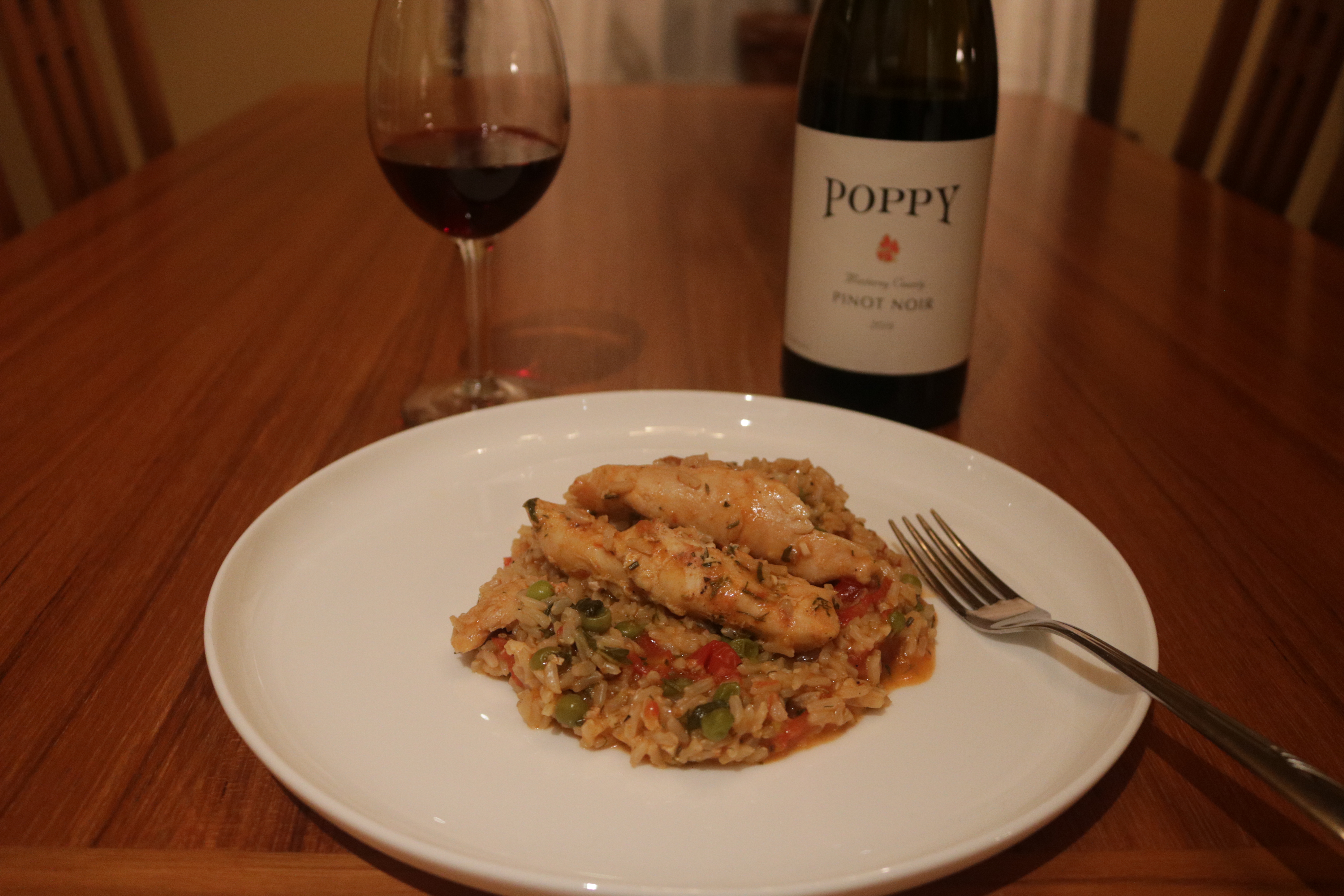 Since there was a lot of seasoning on the rice and chicken, I wanted a wine that would have enough acidity and flavor to match their level, while cutting through the acidic tomatoes. Generally, Pinot Noir is my go-to for lighter chicken dishes, so in this case I tried a Monterey Pinot Noir. It had plenty of bright spice and fruit notes on its own, which brought out the pepper and seasoning on the chicken. Overall, a delicious, flavorful combination!