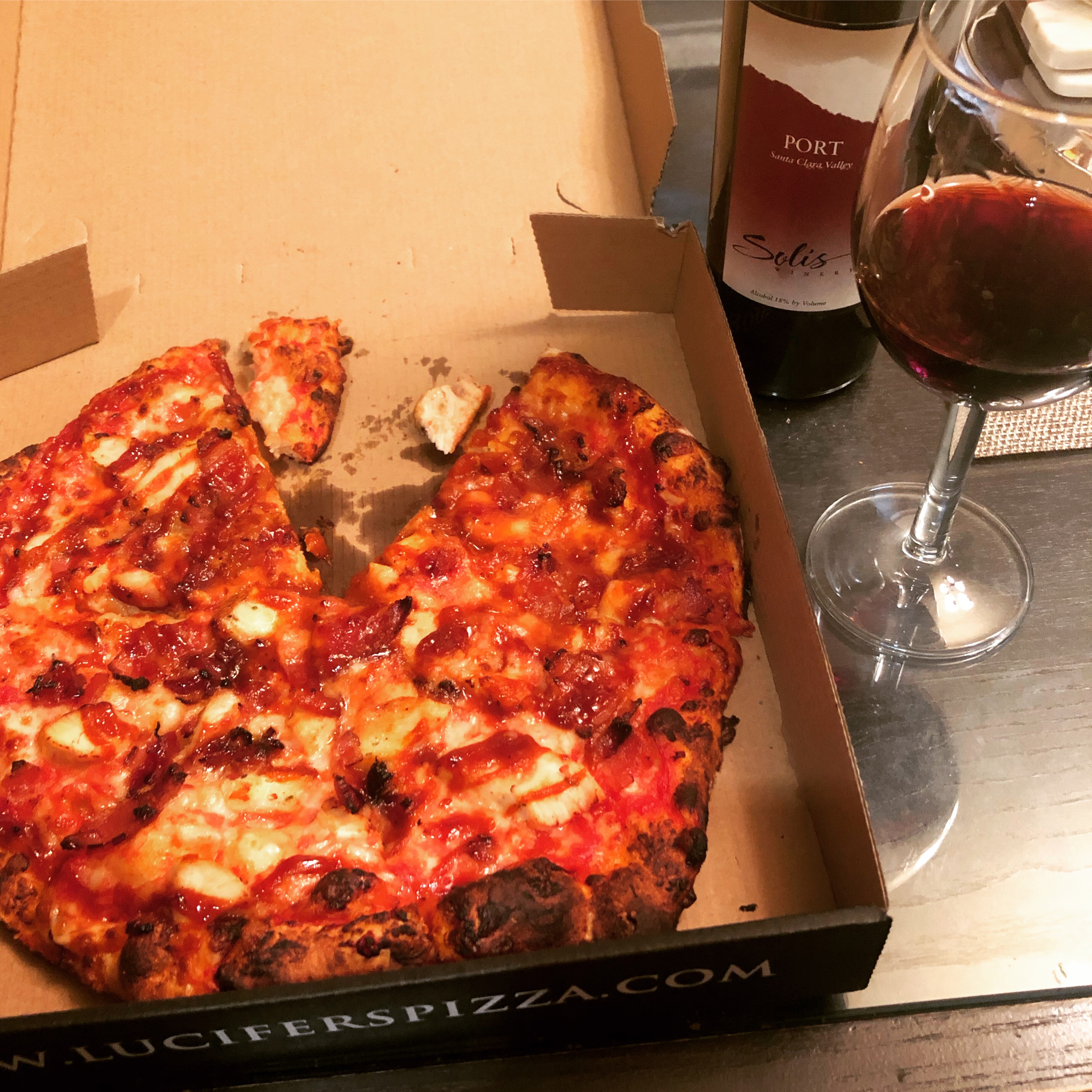 This is one of those pairings you won’t normally hear about. Usually, people drink beer with their pizza, or find a beer-like wine alternative such as a neutral white like Pinot Grigio, or go with a high acid Italian red like Barbera or Sangiovese. I’ve even done Cabernet Sauvignon in the past, too.