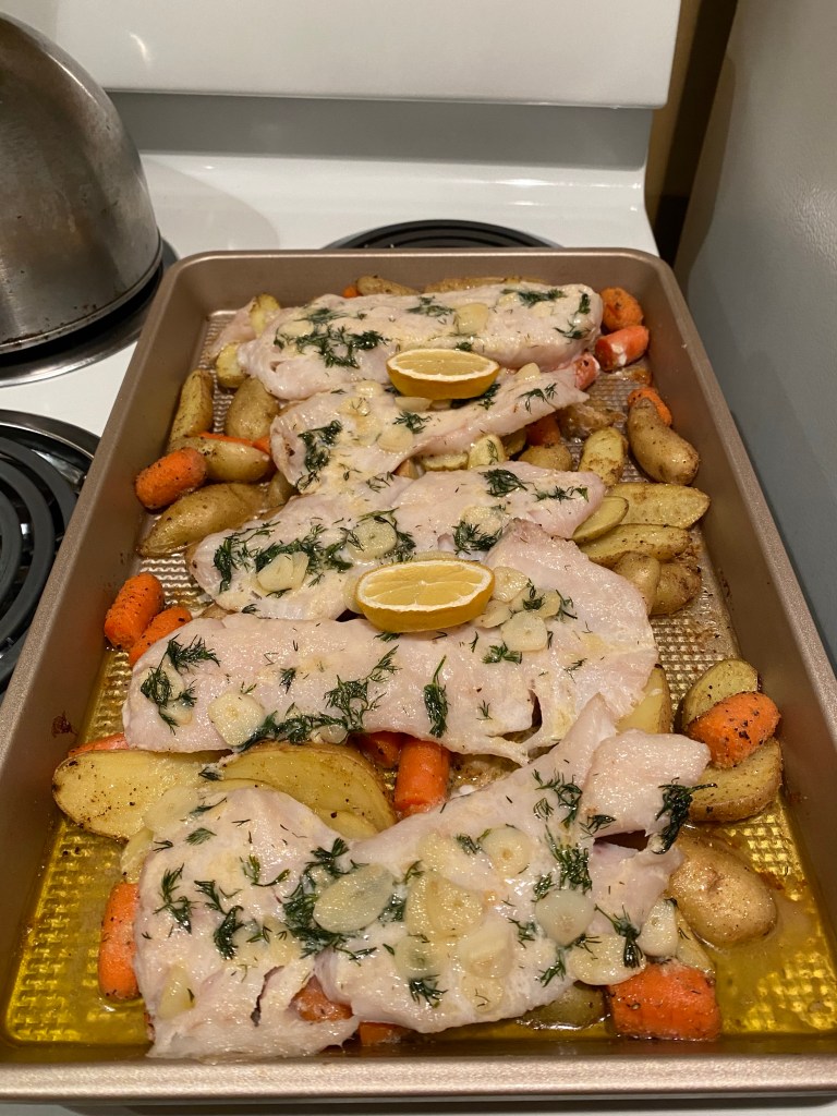 Introducing this one-pan wonder: baked rockfish on top of potatoes and carrots, with a light sauce of butter, garlic and lemon juice on top.