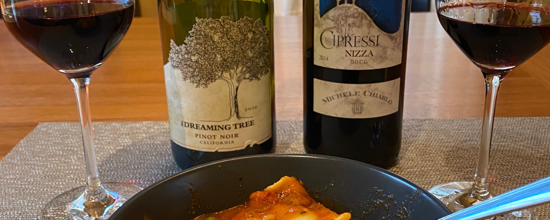 I tried butternut squash ravioli and peas paired with two different red wines: Dreaming Tree Pinot Noir vs. Michele Chiarlo Nizza Cipressi Barbera.