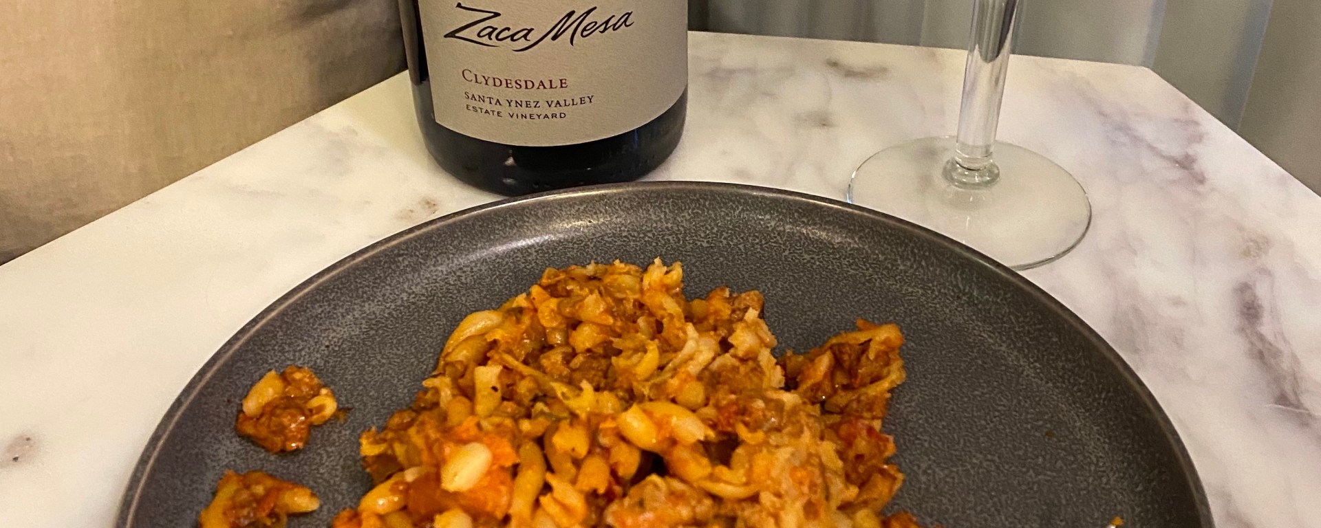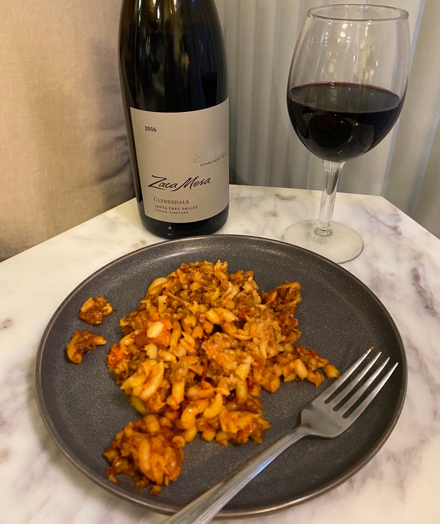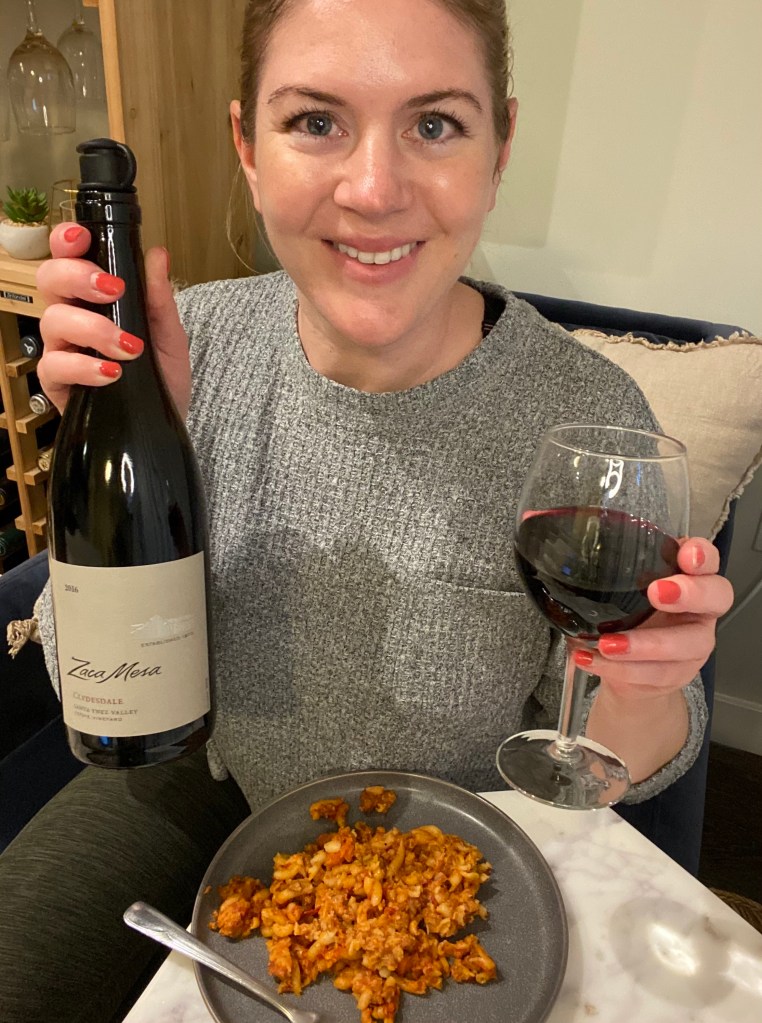 Since it has such beautiful acidity paired with these dark fruit and savory notes, this Syrah is perfect with a turkey pasta. I paired it with some turkey bolognese leftovers — the acidity in the wine was a great match for the tomato sauce, and the savory notes in the wine were excellent with the meat in the pasta.