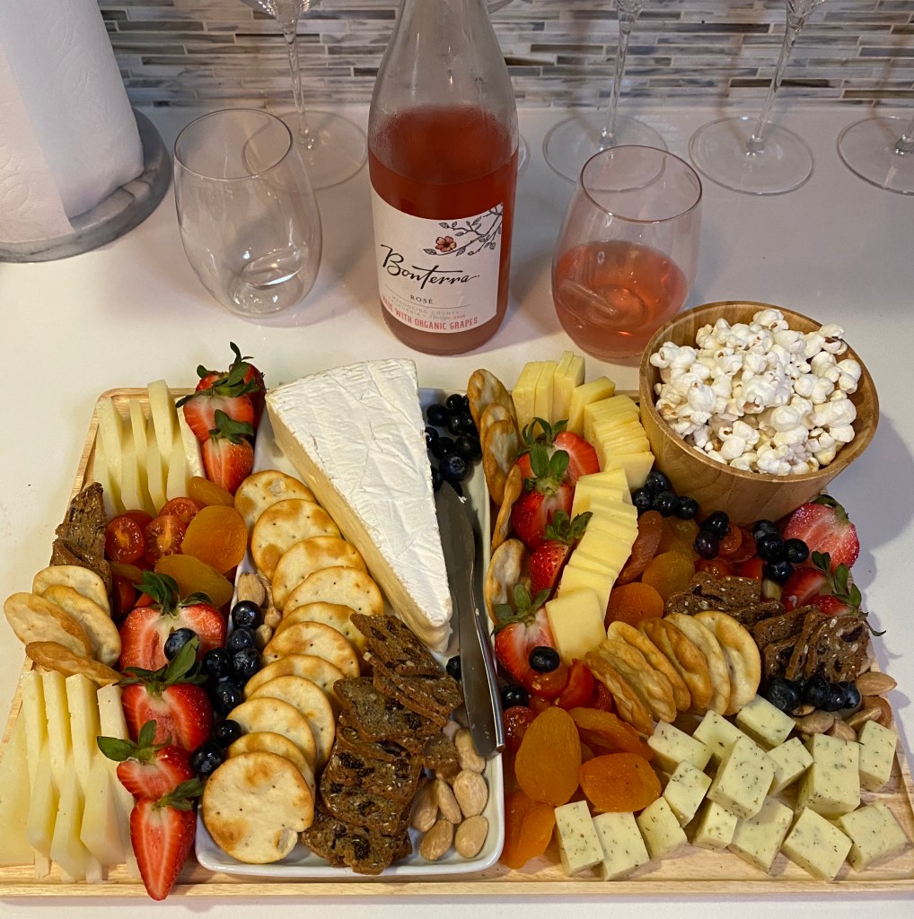 - Bottomless glasses of rosé are a MUST!! Rosé is a perfect cheeseboard wine becasue it has great acidity to balance creamy or sharp cheeses, with bright red fruit notes to complement any fruits or nuts on your board. I’ve recently been getting Bonterra Organic Rosé for pool days and cheese pairings.