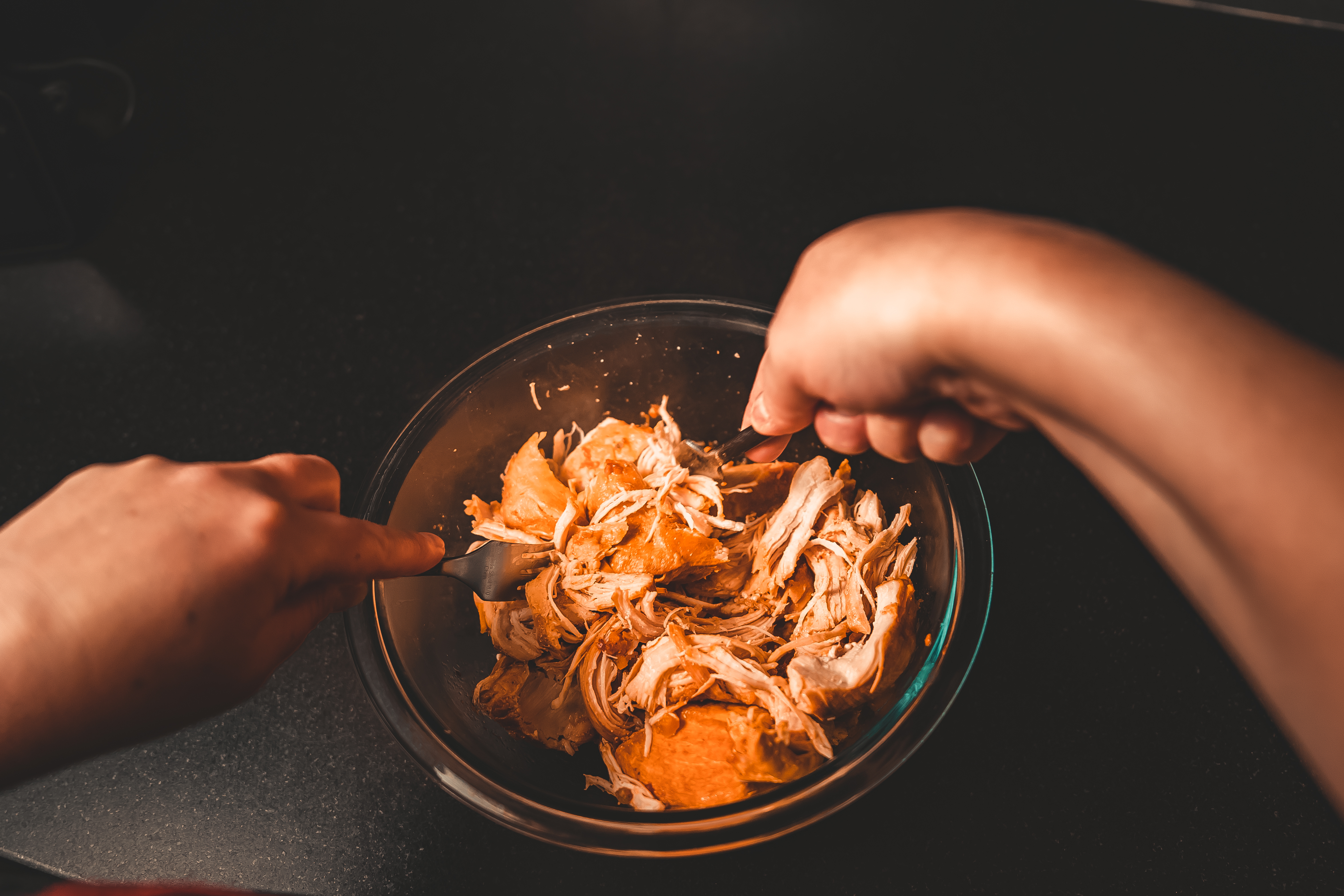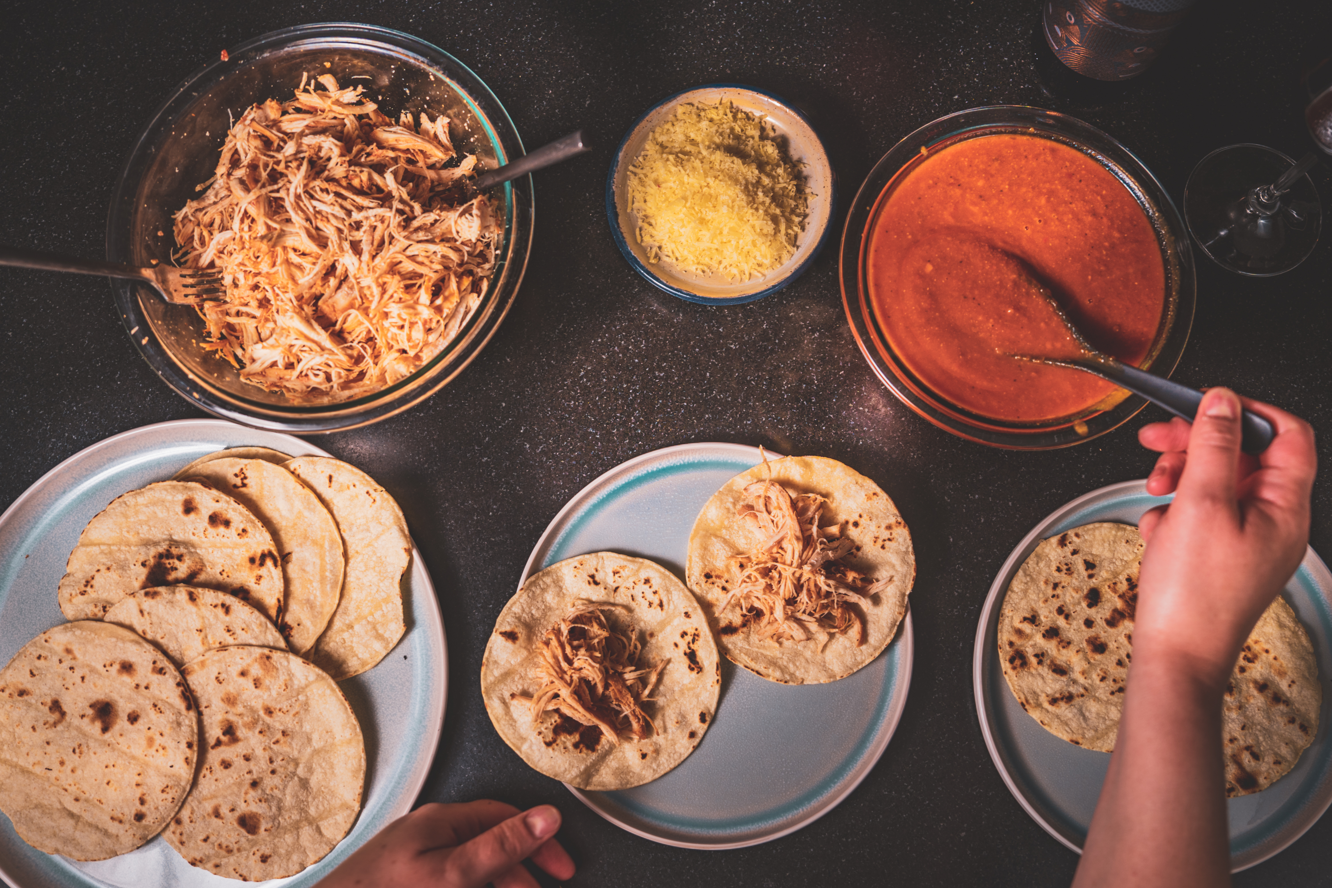 But I won’t bore you with all that. The main thrust is that I use a delicious concoction of adobo chipotle chiles, tomatoes, and garlic to create spicy shredded chicken that is perfect for throwing onto a tortilla for tacos. The process also creates its own sauce that makes for a wonderful, spicy taco sauce.