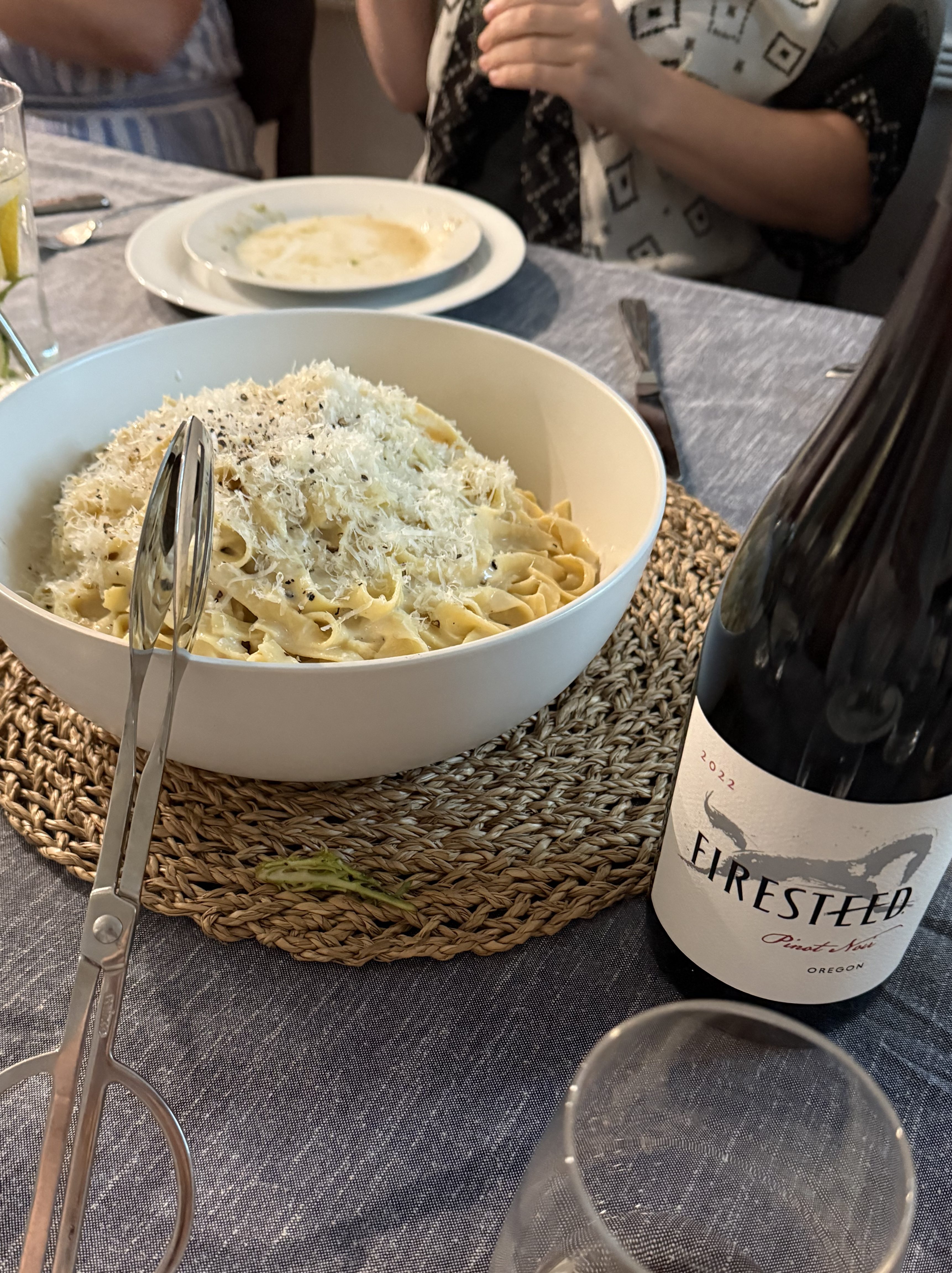 For me, I went with a peppery Pinot Noir. You want to be careful you don’t have a red wine that’s too heavy or it might overpower the cream sauce. So a light, fruity, and peppery Oregon Pinot Noir was perfect in my opinion.